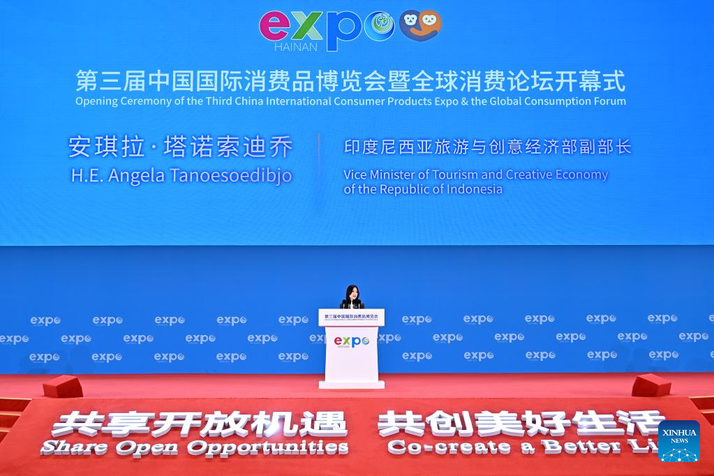 Angela Tanoesoedibjo, Indonesia's vice minister of tourism and creative economy, addresses the opening ceremony of the third China International Consumer Products Expo (CICPE) in Haikou, capital city of south China's Hainan Province, April 10, 2023. More than 3,300 high-quality brands from home and abroad have gathered at the third CICPE, which kicked off Monday in Haikou. (Xinhua/Li Xin)