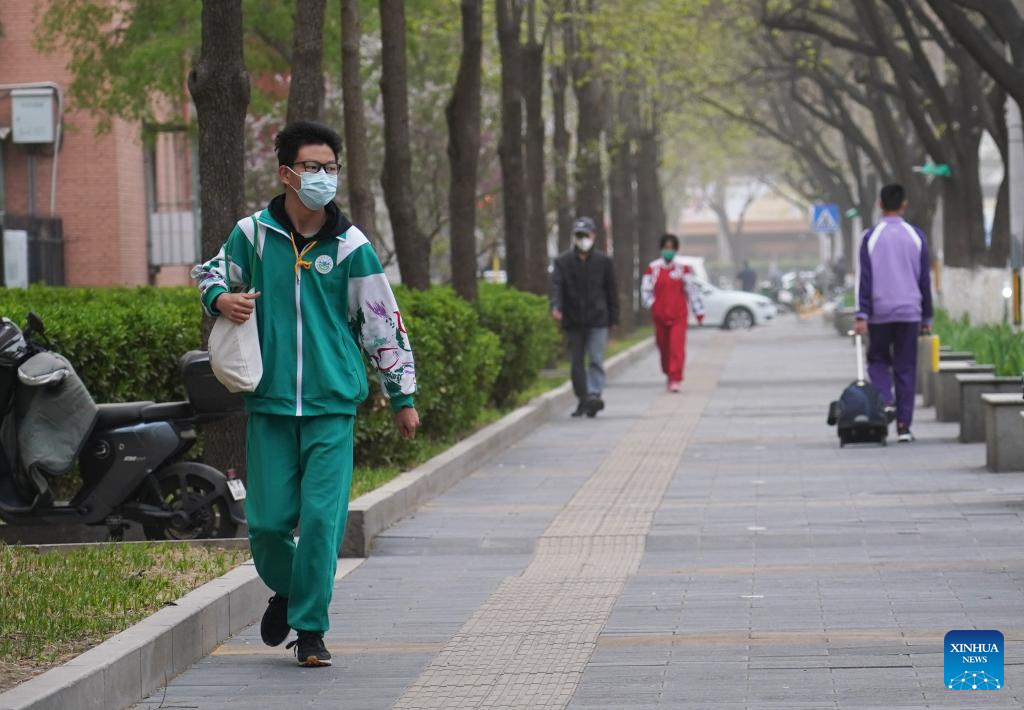 People wearing masks walk on a pavement in Haidian District of Beijing, capital of China, April 11, 2023. Floating sand and dust affected Beijing on Tuesday. (Xinhua/Ren Chao)