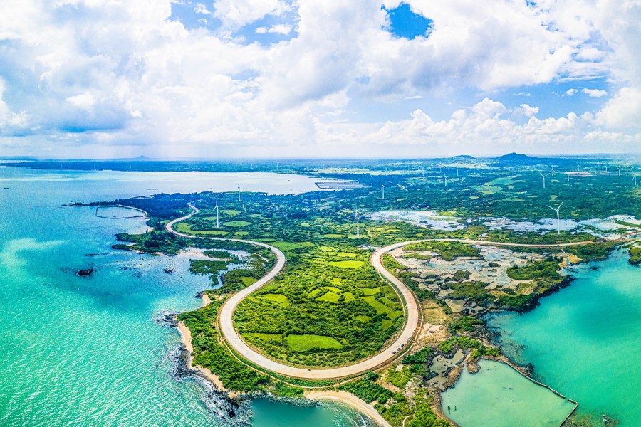 This aerial photo taken on Oct. 6, 2022 shows a section of the round-the-island tourist highway in Danzhou, south China's Hainan Province. (Xinhua/Pu Xiaoxu)