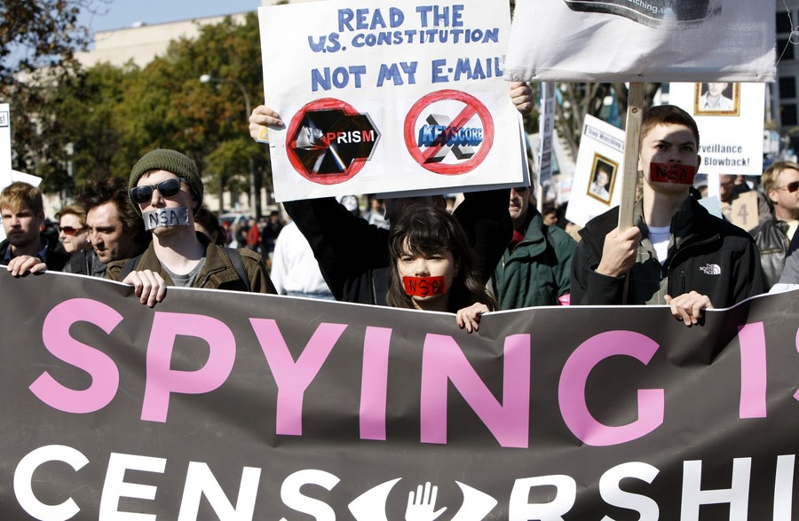 Demonstrators hold placards and banners to protest against government surveillance in Washington D.C., capital of the United Sates, on Oct. 26, 2013. (Xinhua/Fang Zhe)