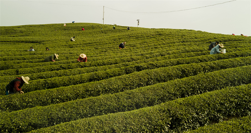 Farmers harvest tea leaves in Chibi city, central China’s Hubei Province. (Photo/Liu Jianguo)