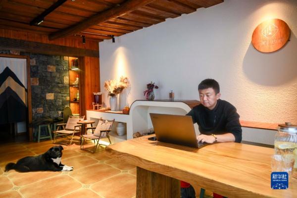 Xu Liang, owner of a B&B hotel located inside a scenic area in Altay prefecture of northwest China's Xinjiang Uygur Autonomous Region, handles orders placed by tourists. (Xinhua/Hu Huhu)
