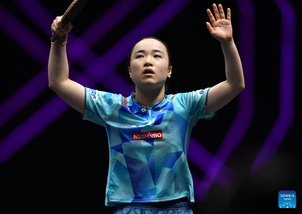 Ito Mima of Japan serves during the women's singles quarterfinal against Sun Yingsha of China at the WTT Champions Xinxiang 2023 in Xinxiang, central China's Henan Province, April 13, 2023. (Xinhua/Li Jianan)