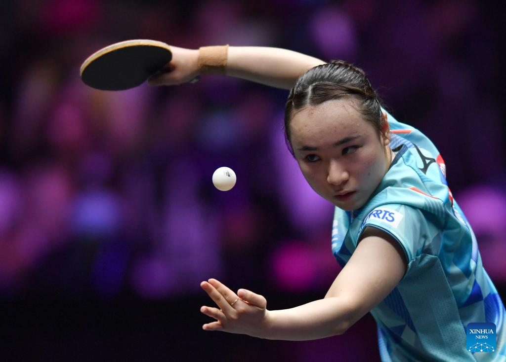 Ito Mima of Japan hits a return during the women's singles quarterfinal against Sun Yingsha of China at the WTT Champions Xinxiang 2023 in Xinxiang, central China's Henan Province, April 13, 2023. (Xinhua/Li Jianan)