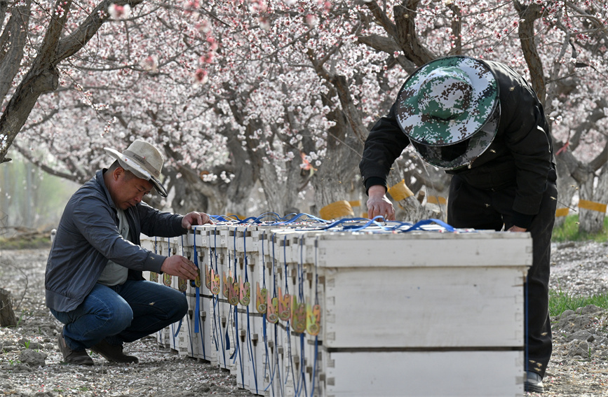 A technician working for a drone apiary and a beekeeper tend honeybees in an apricot orchard in the Bayingolin Mongolian Autonomous Prefecture of northwest China's Xinjiang Uygur Autonomous Region. (Photo/Que Hure)