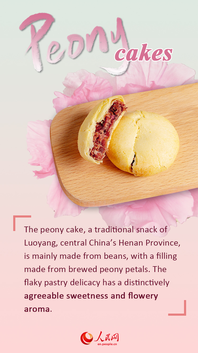 The peony cake, a traditional snack of Luoyang, central China’s Henan Province, is mainly made from beans, with a filling made from brewed peony petals. The flaky pastry delicacy has a distinctively agreeable sweetness and flowery aroma.