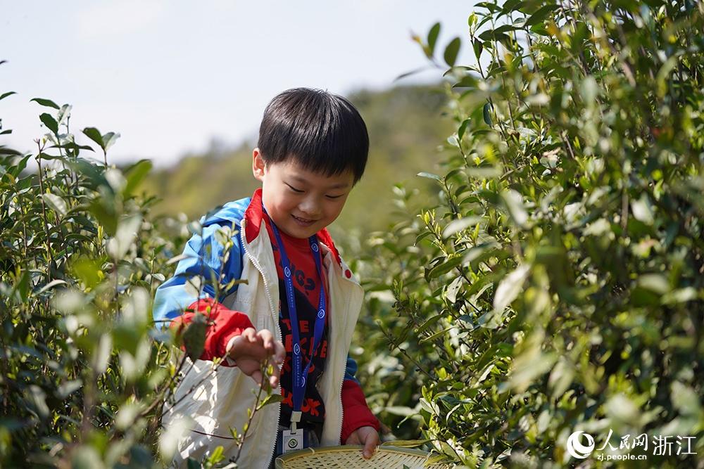 A child picks spring tea leaves at a tea garden in Kuangyan town, Cixi, east China's Zhejiang Province. (People's Daily Online/Zhang Yongtao)