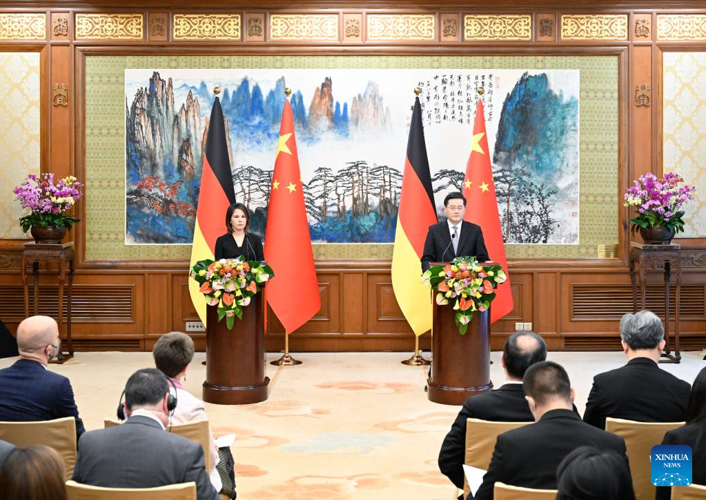 Chinese State Councilor and Foreign Minister Qin Gang and German Foreign Minister Annalena Baerbock meet the press after co-chairing the sixth round of China-Germany strategic dialogue on diplomacy and security in Beijing, capital of China, April 14, 2023. (Xinhua/Shen Hong)