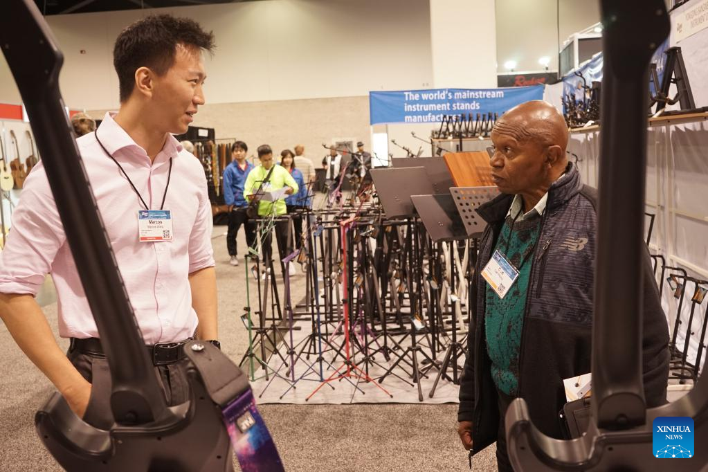 LOS ANGELES, April 14 (Xinhua) -- China-made musical instruments are taking the limelight at an ongoing music industry exhibition in Southern California, attracting lots of attention and recognition from overseas customers and distributors.