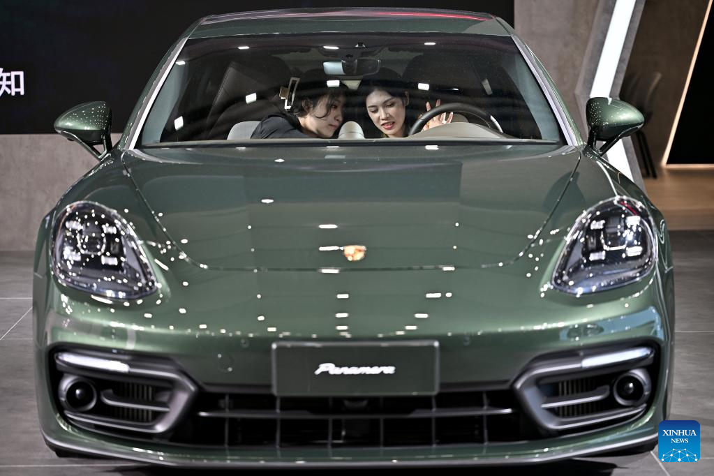 Visitors sit in and learn about an exhibited car at the third China International Consumer Products Expo (CICPE) in Haikou, capital city of south China's Hainan Province, on April 14, 2023. The expo opened to the public on Friday. (Xinhua/Li Xin)