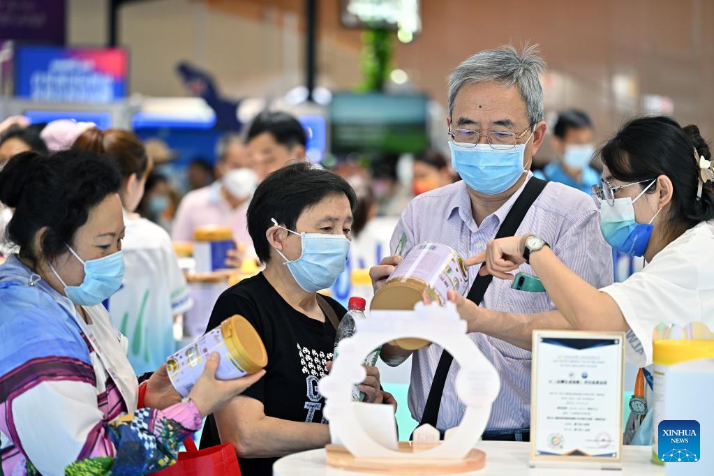 Visitors select milk powder at the booth of Hoeslandt at the third China International Consumer Products Expo (CICPE) in Haikou, capital city of south China's Hainan Province, on April 14, 2023. The expo opened to the public on Friday. (Xinhua/Li Xin)