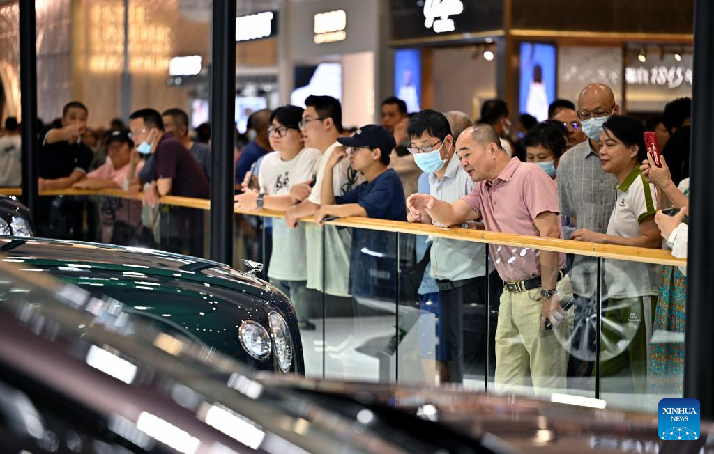 Visitors take a look at the booth of Bentley at the third China International Consumer Products Expo (CICPE) in Haikou, capital city of south China's Hainan Province, on April 14, 2023. The expo opened to the public on Friday. (Xinhua/Li Xin)