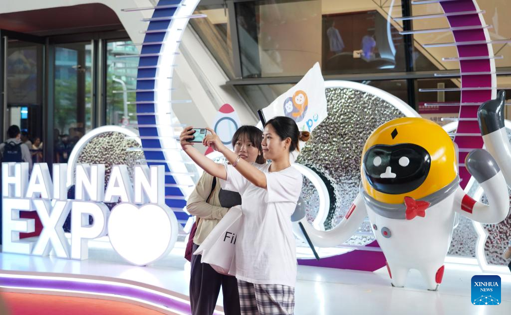 Visitors take a selfie at the third China International Consumer Products Expo (CICPE) in Haikou, capital city of south China's Hainan Province, on April 14, 2023. The expo opened to the public on Friday. (Xinhua/Li Xin)