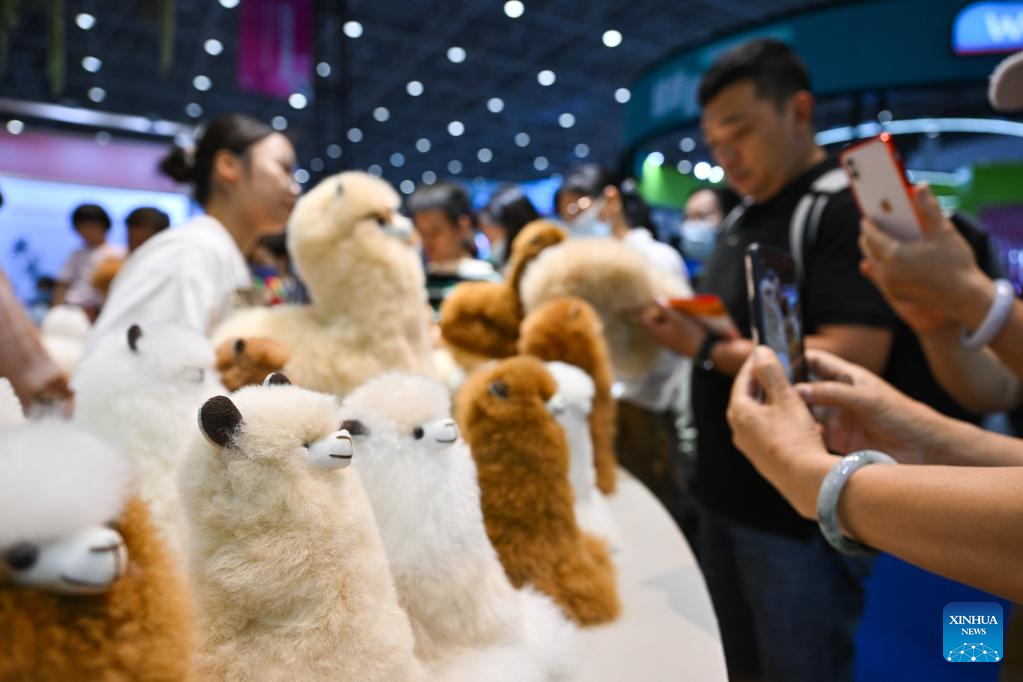 People select alpaca dolls at the third China International Consumer Products Expo (CICPE) in Haikou, capital city of south China's Hainan Province, on April 14, 2023. The expo opened to the public on Friday. (Xinhua/Wang Zecong)