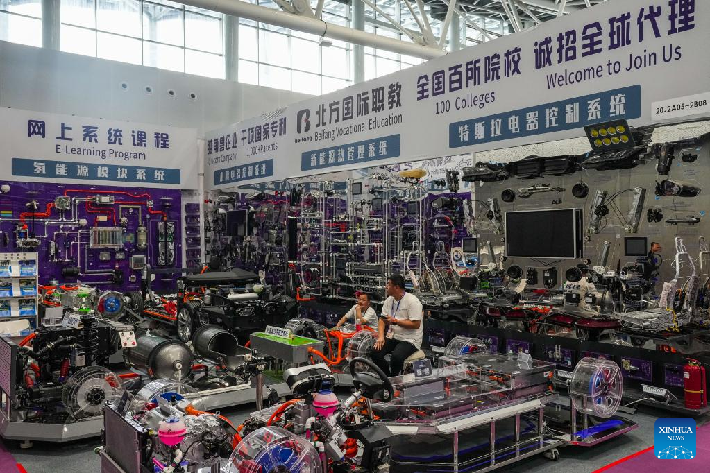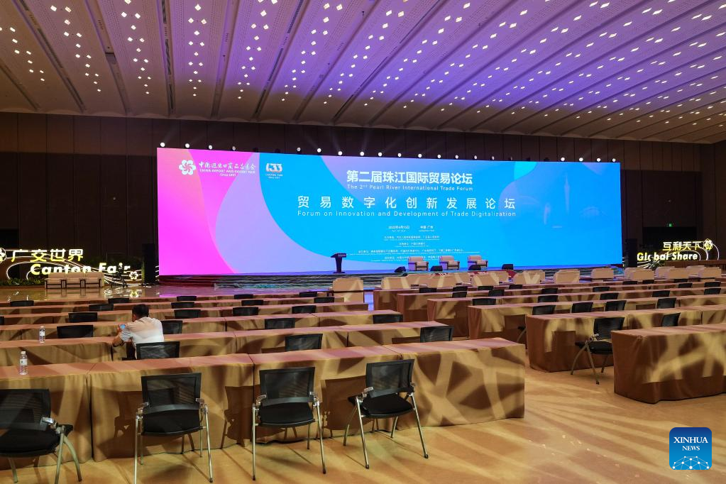 This photo taken on April 14, 2023 shows a venue for a forum of the 133rd session of China Import and Export Fair in Guangzhou, south China's Guangdong Province. This event, also known as the Canton Fair, will be held in the southern Chinese city of Guangzhou from April 15 to May 5. All the preparations for the event have been finished by now. (Xinhua/Liu Dawei)