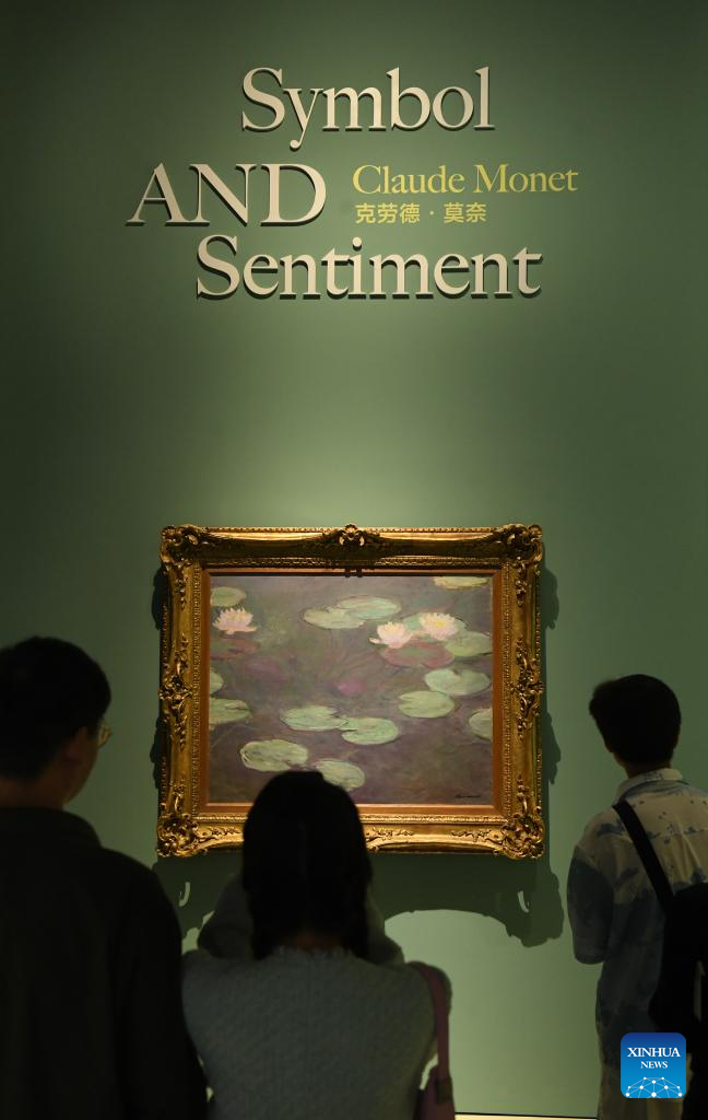Visitors look at "Pink Water Lilies" by Claude Monet at the Hangzhou Pavilion of the Meet You Museum in Hangzhou, East China's Zhejiang Province, April 14, 2023. The Hangzhou Pavilion of the Meet You Museum officially opened on Friday. Two exhibitions featuring artworks of well-known Western artists including Vincent van Gogh and Claude Monet were launched for the public on the opening day. (Xinhua/Weng Xinyang)