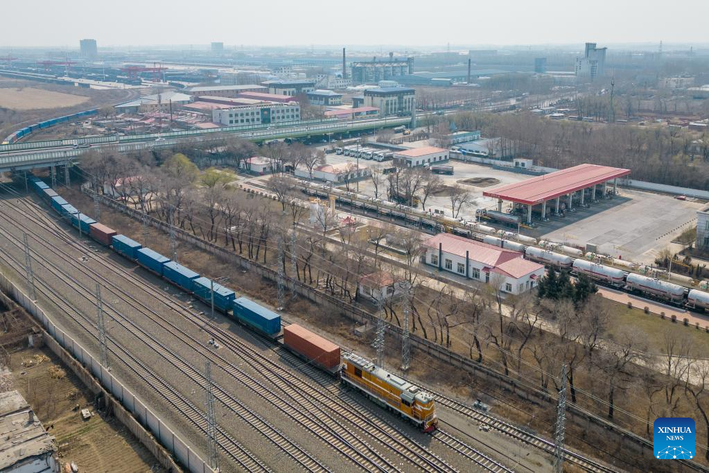 This aerial photo taken on April 16, 2023 shows a China-Europe freight train loaded with Chinese-brand vehicles leaving from the Harbin international container center station in Harbin, capital of northeast China's Heilongjiang Province. (Xinhua/Zhang Tao)