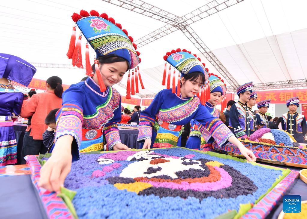 Candidates arrange their creations for a contest of colorful meals made with glutinous rice at a cultural square in Dahua Yao Autonomous County, south China's Guangxi Zhuang Autonomous Region, April 15, 2023. A gourmet competition was held here on Saturday to mark the traditional Sanyuesan festival, which falls on the third day of the third month on the lunar calendar. Hundreds of dishes made with indigenous produces participated in the competition. (Xinhua/Huang Xiaobang)