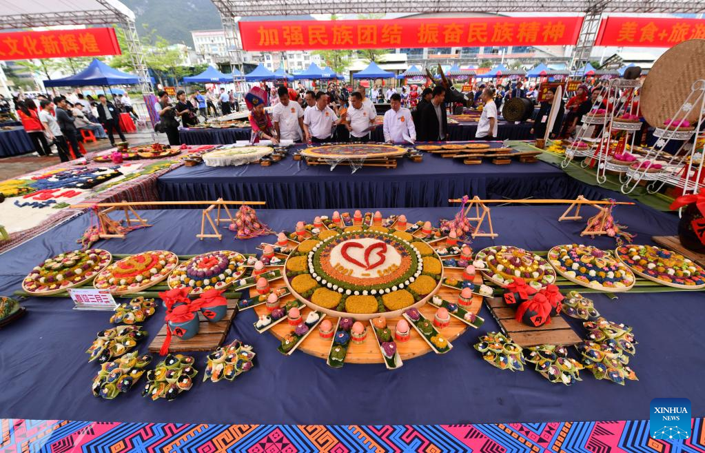 Candidates present their creations for a contest of specialty dishes at a cultural square in Dahua Yao Autonomous County, south China's Guangxi Zhuang Autonomous Region, April 15, 2023. A gourmet competition was held here on Saturday to mark the traditional Sanyuesan festival, which falls on the third day of the third month on the lunar calendar. Hundreds of dishes made with indigenous produces participated in the competition. (Xinhua/Huang Xiaobang)