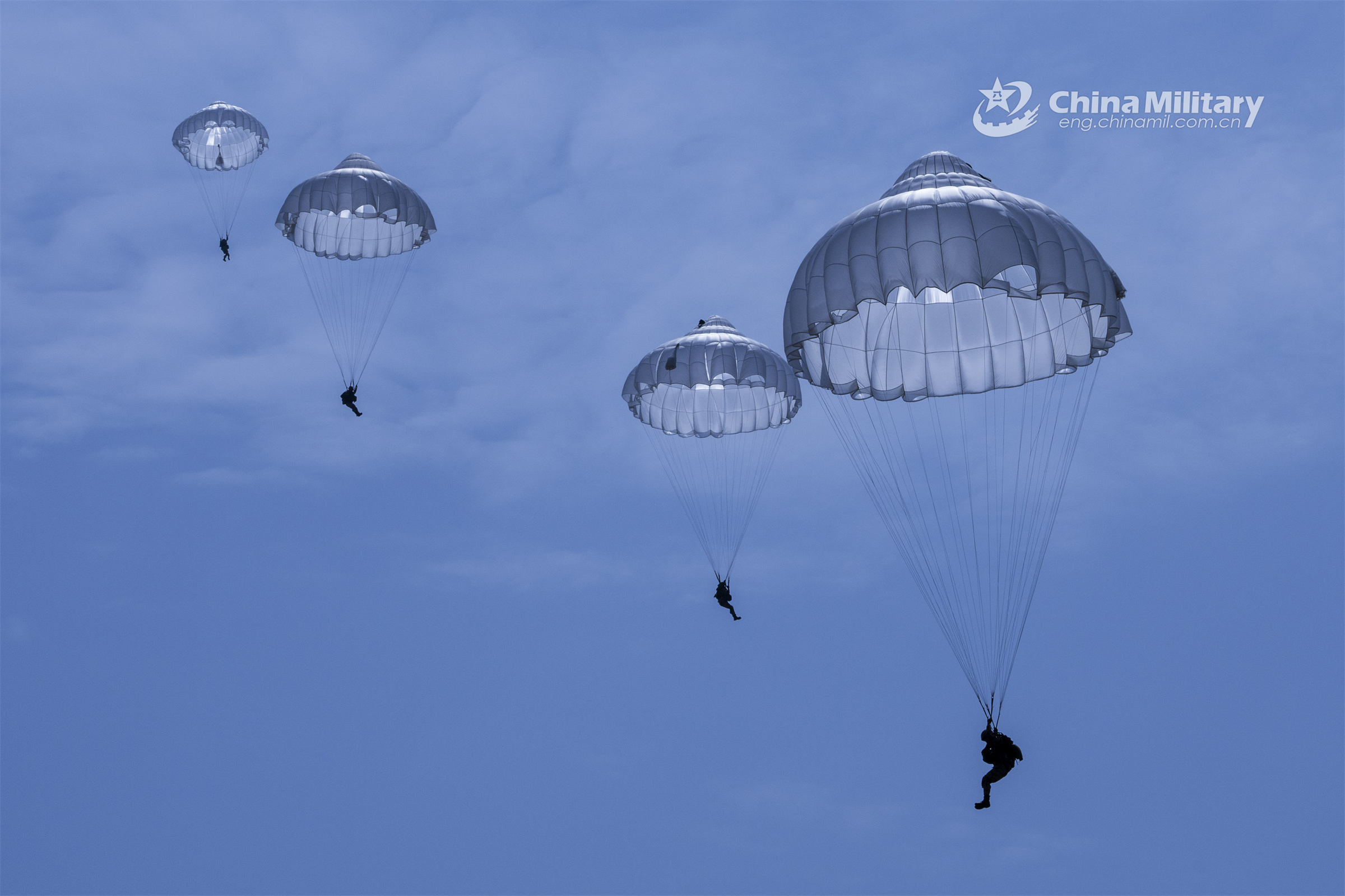 Paratroopers assigned to an airborne brigade with the air force steer their parachutes before landing at a drop zone during a military jump in early April, 2023. (eng.chinamil.com.cn/Photo by Yang Jielin)