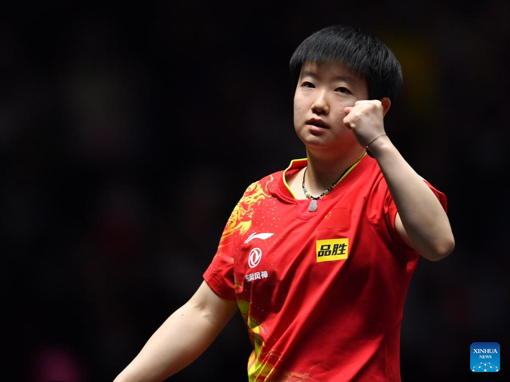 Sun Yingsha of China celebrates after the women's singles final against her compatriot Wang Yidi at the WTT Champions Xinxiang 2023 in Xinxiang, central China's Henan Province, April 15, 2023. (Xinhua/Li Jianan)
