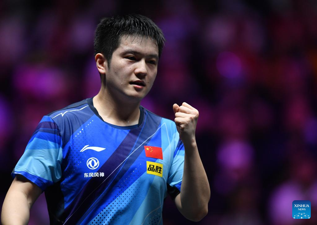 Fan Zhendong of China celebrates during the men's singles final against his compatriot Liang Jingkun at the WTT Champions Xinxiang 2023 in Xinxiang, central China's Henan Province, April 15, 2023. (Xinhua/Li Jianan)