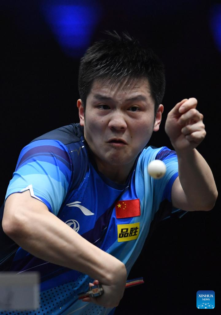 Fan Zhendong of China hits a return during the men's singles final against his compatriot Liang Jingkun at the WTT Champions Xinxiang 2023 in Xinxiang, central China's Henan Province, April 15, 2023. (Xinhua/Li Jianan)