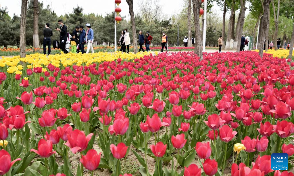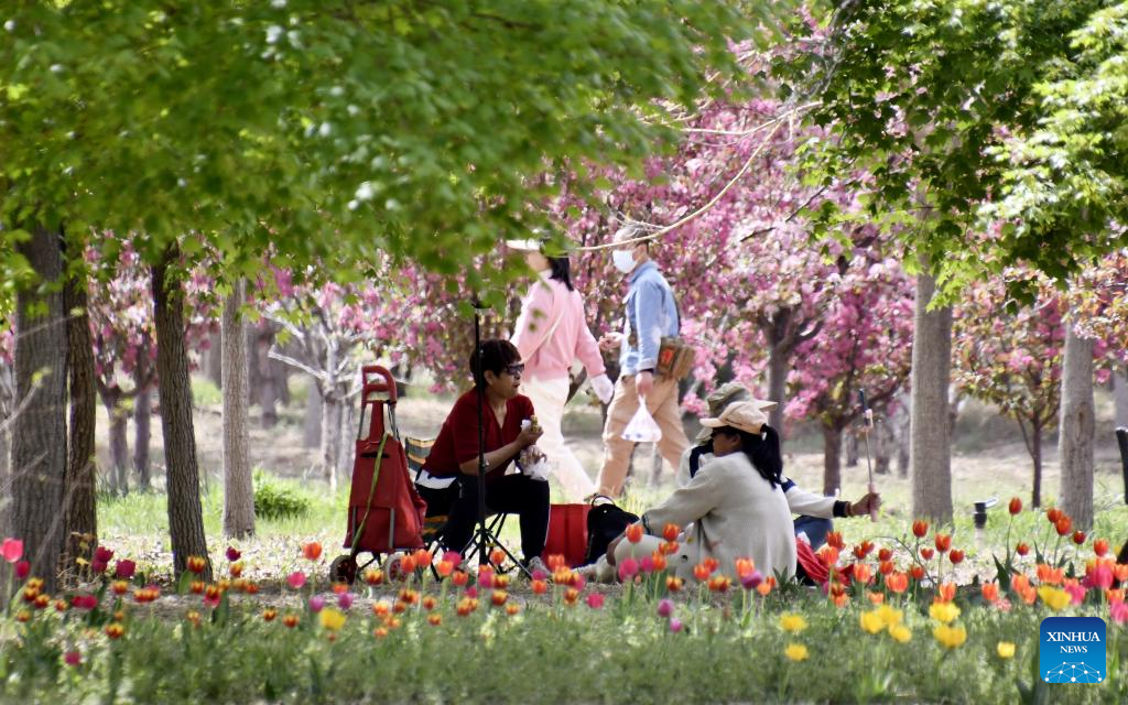 Tourists enjoy the scenery of blooming flowers by Yongding River in Daxing District of Beijing, capital of China, April 15, 2023. Colorful flowers of various species are in full bloom, attracting many tourists to spend their leisure time here. (Xinhua/Li Xin)