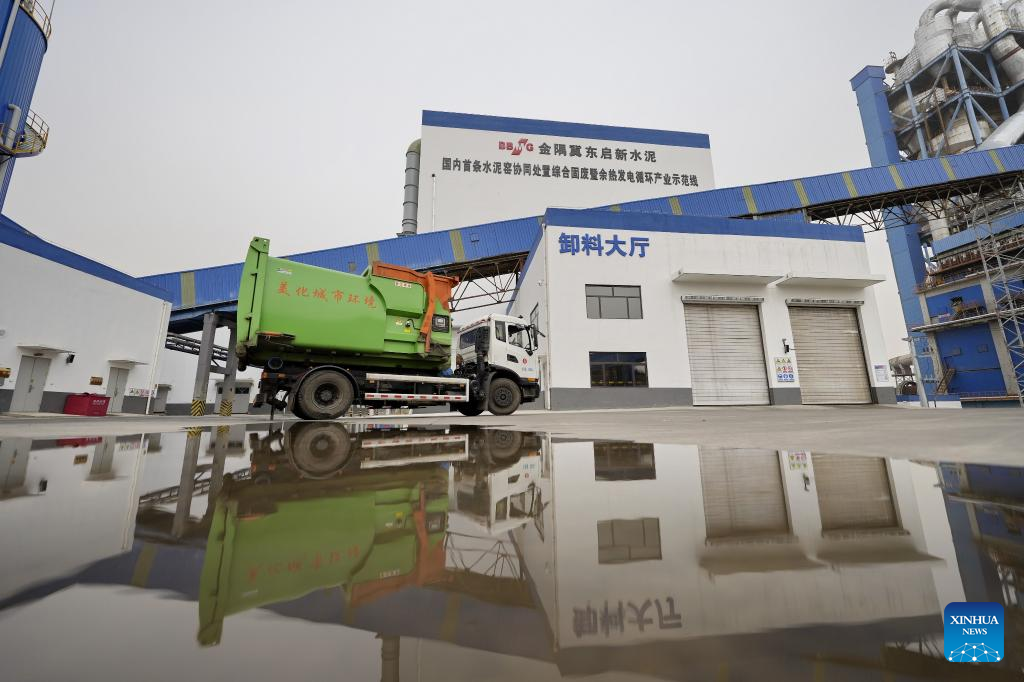 A garbage truck unloads wastes at the factory of Tangshan Jidong Qixin Cement Co., Ltd. in Tangshan, north China's Hebei Province, April 13, 2023. The history of Tangshan Jidong Qixin Cement Co., Ltd., formerly known as Tangshan Qixin Cement Plant, dates back to 1889. In recent years, the company has switched to a high-quality green development mode, achieving both economic and ecological benefits. (Xinhua/Mu Yu)