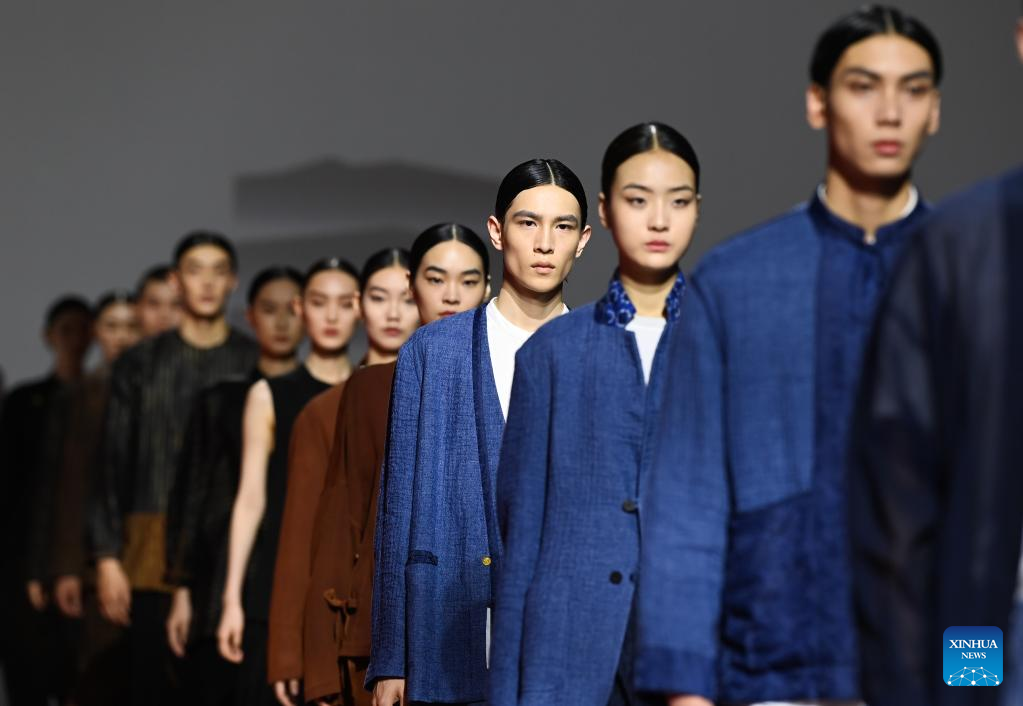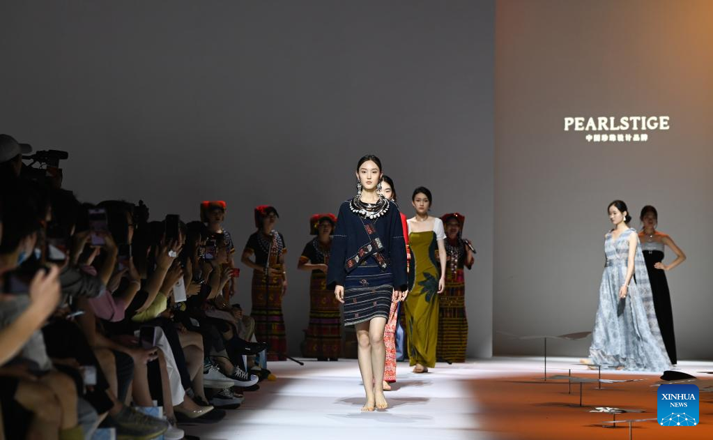 Models present creations during the fashion week at the third China International Consumer Products Expo (CICPE) in Haikou, capital city of south China's Hainan Province, on April 14, 2023. The fashion week, scheduled from April 10 to 15, concluded on Saturday in Haikou. (Xinhua/Yang Guanyu)