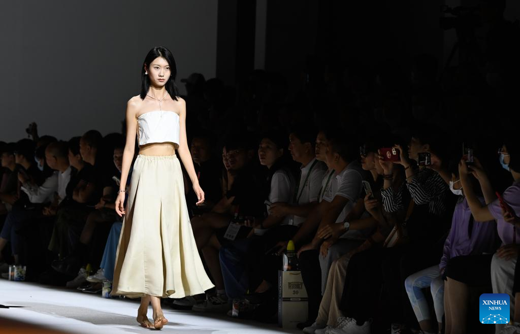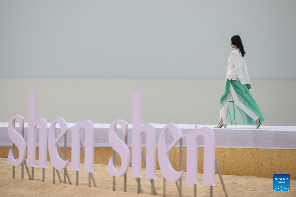 Models present creations during the fashion week at the third China International Consumer Products Expo (CICPE) in Haikou, capital city of south China's Hainan Province, on April 11, 2023. The fashion week, scheduled from April 10 to 15, concluded on Saturday in Haikou. (Xinhua/Pu Xiaoxu)