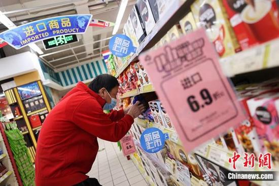A supermarket employee in Taiyuan, Shanxi Province, checks shelves of imported goods. (File photo /China News Service)