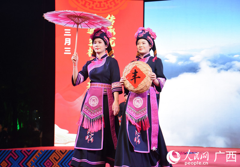 People present Mulao ethnic group costume at a fashion show held in Dahua Yao Autonomous County, Hechi city, south China's Guangxi Zhuang Autonomous Region. (People's Daily Online/Wang Gongxiao)