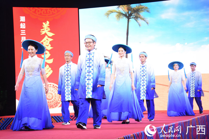People present Jing ethnic group costume at a fashion show held in Dahua Yao Autonomous County, Hechi city, south China's Guangxi Zhuang Autonomous Region. (People’s Daily Online/Wang Gongxiao)