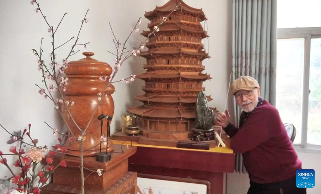 Marc Verlant introduces a miniature of ancient Chinese tower, which is among his personal collection, at his residence at the foot of the Wudang Mountains, central China's Hubei Province, April 4, 2023. Located at the foot of the Wudang Mountains in central China's Hubei Province is the home of 64-year-old Marc Verlant, which boasts a stunning collection of Chinese artifacts. (Xinhua/Xu Penghang)
