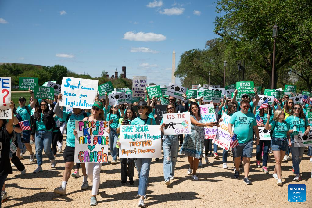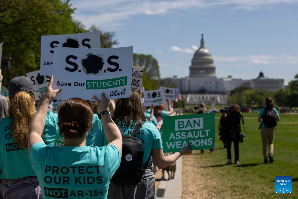 People march to the Capitol to protest for a ban on assault weapons, in Washington, D.C., the United States, on April 17, 2023. (Photo by Aaron Schwartz/Xinhua)