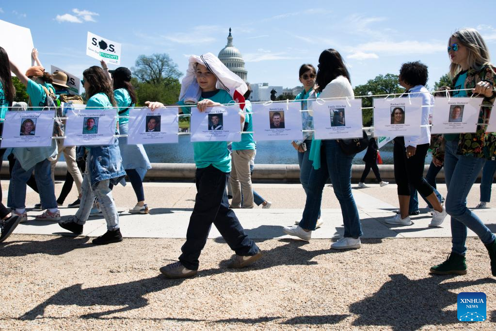 People display photos of victims of gun violence during a march to the Capitol to protest for a ban on assault weapons, in Washington, D.C., the United States, on April 17, 2023. (Photo by Aaron Schwartz/Xinhua)
