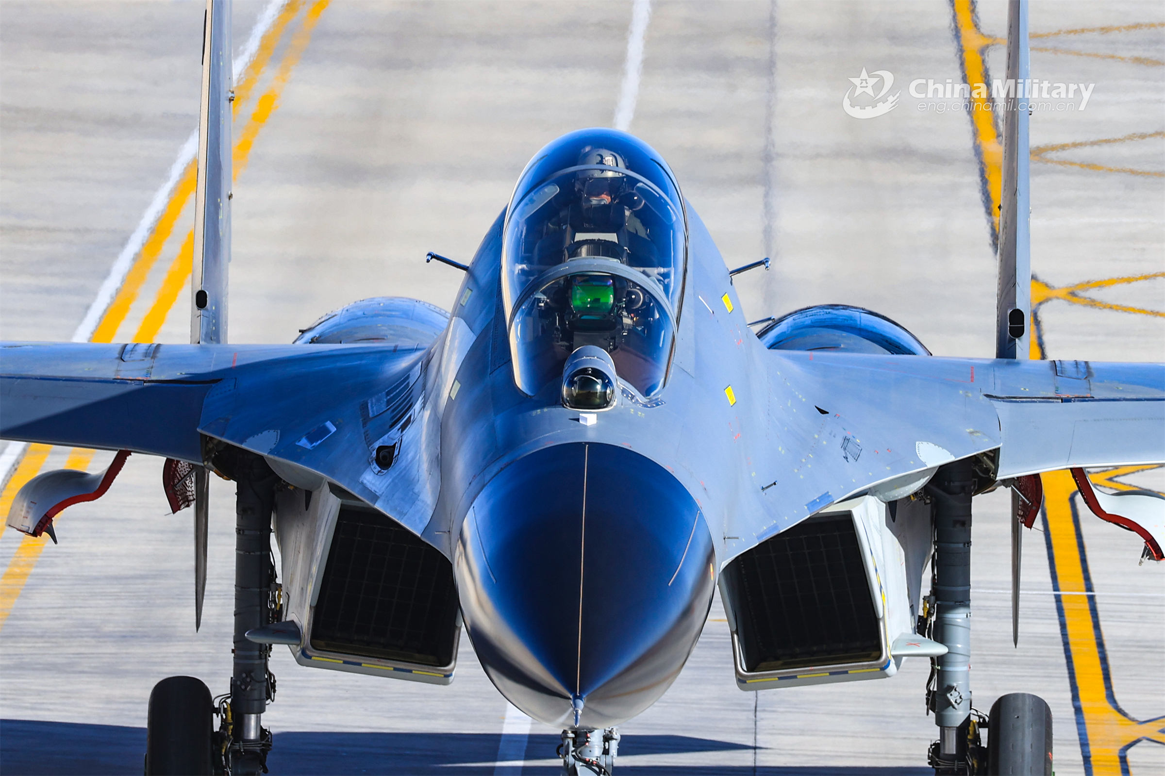 Fighter jet attached to an aviation brigade of the air force taxis on the runway during a round-the-clock flight training exercise on March 31, 2023. (eng.chinamil.com.cn/Photo by Cui Baoliang)
