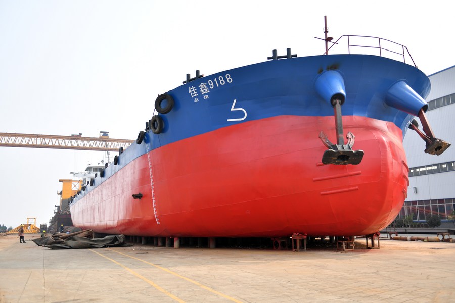 This photo taken on March 2, 2023 shows a cargo ship at a shipbuilding enterprise in Yuanjiang, central China's Hunan Province. (Xinhua/Chen Zhenhai)