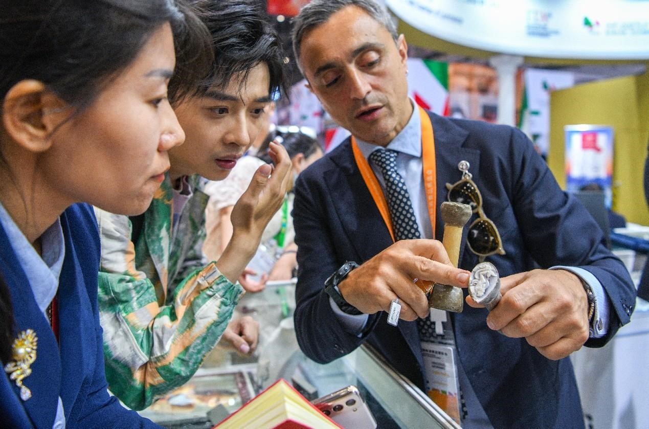 A foreigner introduces shell carving techniques to Chinese visitors at the booth of Italy at the Hainan International Convention and Exhibition Center, Haikou, south China's Hainan province, April 11, 2023. (People's Daily Online/Su Bikun)