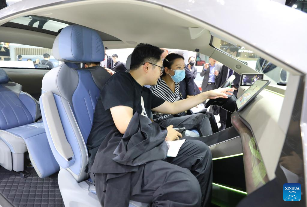 Visitors try a HarmonyOS-based on-board intelligent computer terminal at the Huawei booth at the 20th Shanghai International Automobile Industry Exhibition in east China's Shanghai, April 18, 2023.?(Xinhua/Fang Zhe)