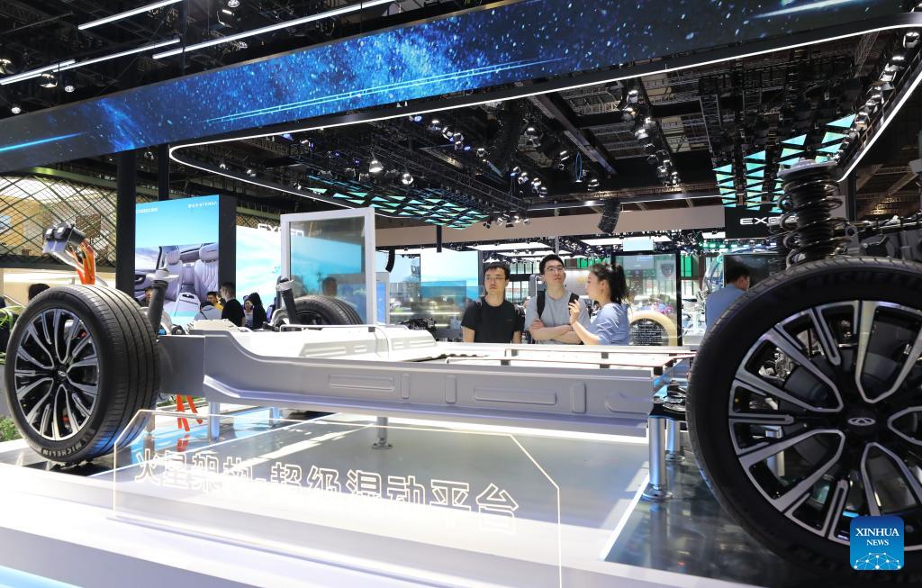 A staff member introduces a hybird platform of Chinese carmaker Chery at the 20th Shanghai International Automobile Industry Exhibition in east China's Shanghai, April 19, 2023.?(Xinhua/Fang Zhe)