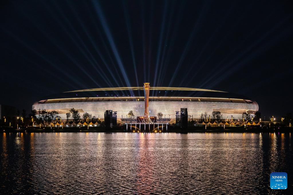 Photo taken on April 19, 2023 shows the stadium for the opening ceremony and cauldron in the light show for 100-day countdown to the Chengdu 2021 FISU World University Games at Dong'an Lake Sports Park in Chengdu, southwest China's Sichuan Province. (Xinhua/Shen Bohan)