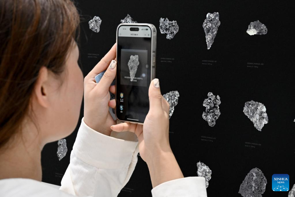 A visitor uses augmented reality (AR) technology with mobile phone at an exhibition themed on lunar soil research achievements in University of Science and Technology of China, in Hefei, east China's Anhui Province, April 19, 2023. (Xinhua/Huang Bohan)