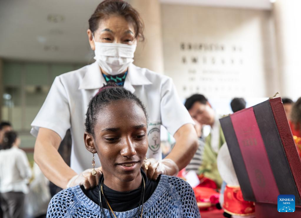 A woman experiences traditional Chinese treatment during an event celebrating the upcoming UN Chinese Language Day in Rio de Janeiro, Brazil, on April 19, 2023. The UN Chinese Language Day is observed every year on or around April 20, when the contribution of Chinese literature, poetry, and language to world culture is highlighted. (Xinhua/Wang Tiancong)