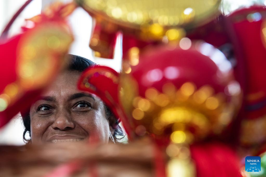 A woman looks at Chinese handicrafts during an event celebrating the upcoming UN Chinese Language Day in Rio de Janeiro, Brazil, on April 19, 2023. The UN Chinese Language Day is observed every year on or around April 20, when the contribution of Chinese literature, poetry, and language to world culture is highlighted. (Xinhua/Wang Tiancong)