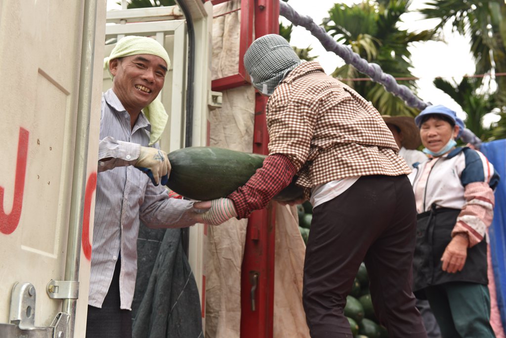 Photo shows workers loading wax gourds on a truck at a vegetable production base in Shantang village, Tunchang county, south China's Hainan Province. (Photo/Lin Xiaodan)