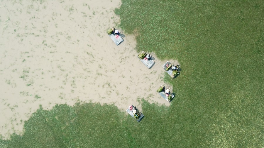Workers collect aquatic plants at Datong Lake aquatic plants industrial demonstration park in Yiyang, central China's Hunan Province, April 20, 2023. (Xinhua/Chen Zhenhai)