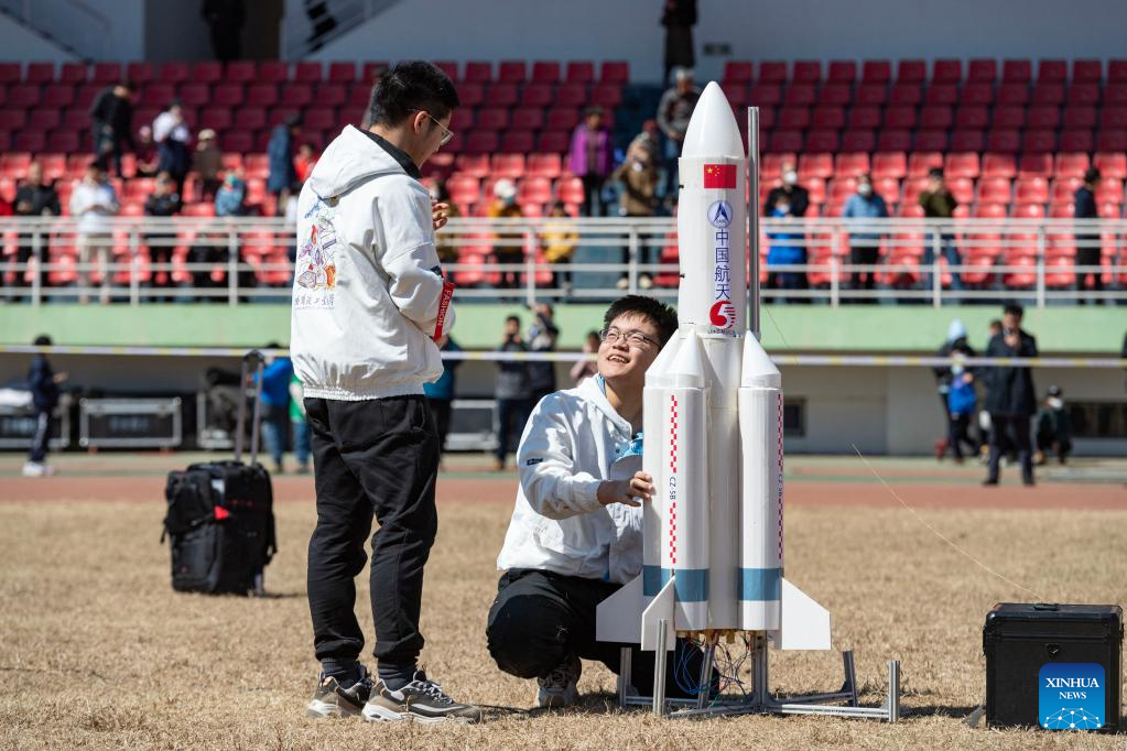 Students from the aviation model association of Harbin Institute of Technology prepares to launch a rocket on campus in Harbin, capital of northeast China's Heilongjiang Province, on April 22, 2023. Activities are held in Harbin Institute of Technology to celebrate the upcoming Space Day of China, which falls on April 24. (Xinhua/Xie Jianfei)
