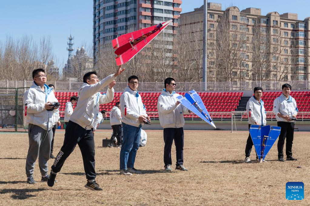 Students from the aviation model association of Harbin Institute of Technology launch a model airplane on campus in Harbin, capital of northeast China's Heilongjiang Province, on April 22, 2023. Activities are held in Harbin Institute of Technology to celebrate the upcoming Space Day of China, which falls on April 24. (Xinhua/Xie Jianfei)